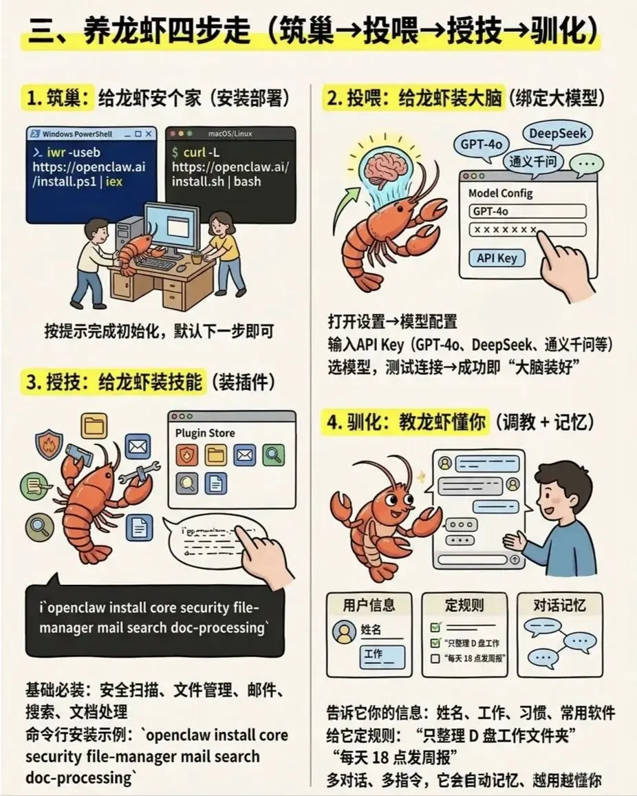 - 配置流程:交互式向导引导,可对接微信、钉钉等聊天工具。