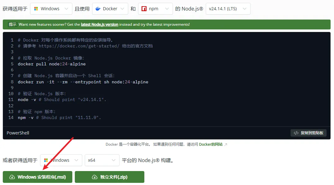 直接去官网下载安装程序,链接:https://nodejs.org/zh-cn/download