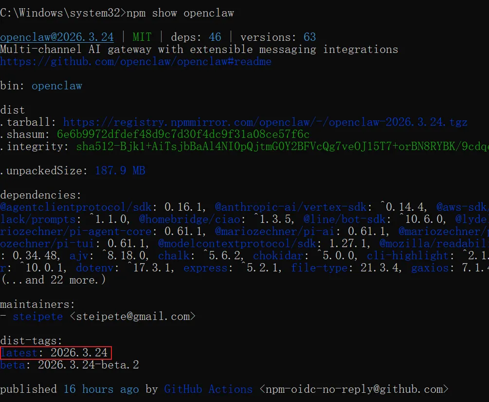 在执行安装命令之前,我们可以通过npm show openclaw来查看一下 OpenClaw 的信息
