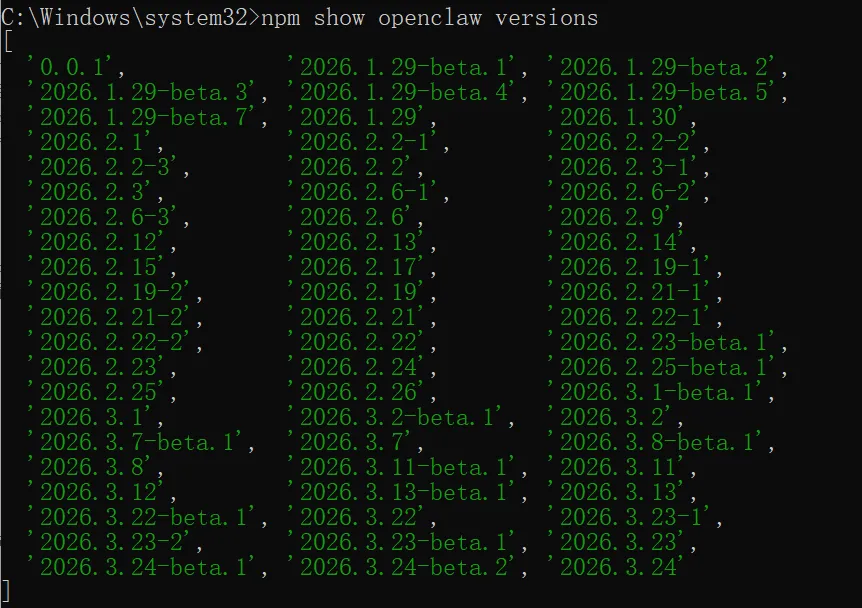 通过npm show openclaw versions来查看一下 OpenClaw 的所有版本