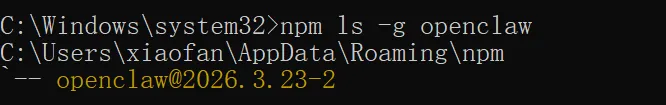 另一种是 npm 的方式,我们执行npm ls -g openclaw,看一下全局有没有安装 openclaw