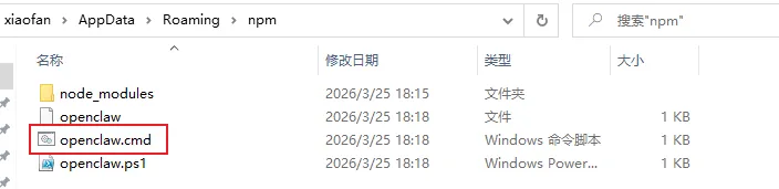 我们再来看一下 clawhub 命令有没有被安装,看看clawhub -V能否正常执行。和前边安装 openclaw 一样,clawhub 的安装位置也是在~\AppData\Roaming\npm,你可以打开目录验证一下。