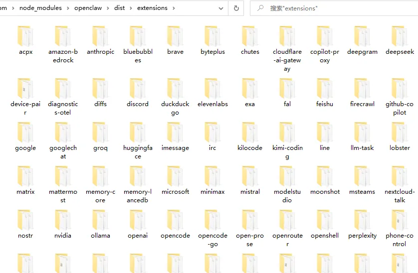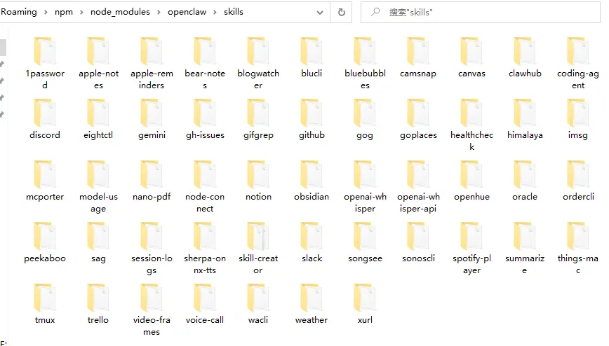 openclaw 这个命令正是被安装到了~\AppData\Roaming\npm目录,除了命令其它的信息被安装在了~\AppData\Roaming\npm\node_modules\openclaw目录,我们且称之为安装目录,我们打开看一下,比如内置的技能是在<安装目录>\skills目录下,内置的插件是在<安装目录>\dist\extensions目录下。
