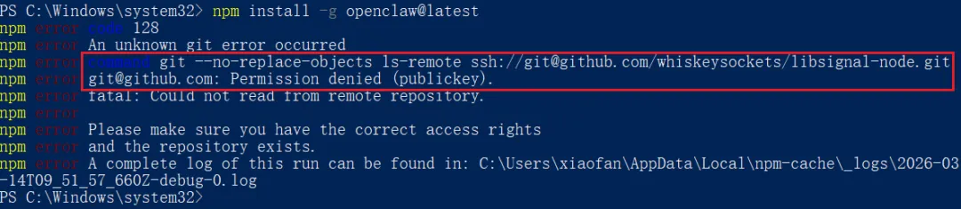 我们看到在执行git --no-replace-objects ls-remote ssh://git@github.com/whiskeysockets/libsignal-node.git时,遇到了关于 publickey 权限不足的问题。这是因为这里访问 Github 仓库协议用的是 ssh ,它是需要身份认证的,需要额外的配置才行,这个配置起来还比较麻烦,需要生成一对公钥和私钥,私钥安装在本地,公钥上传到 Github,没有配置的话,是访问不通的。我们不想折腾公钥密钥的话,可以用下边的命令把 ssh 协议全局替换成 https 协议。