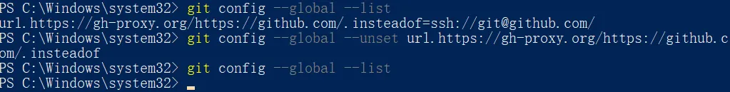 # 查看给Git设置的所有的全局变量git config --global --list# 取消刚刚设置的变量git config --global --unset url."https://gh-proxy.org/https://github.com/".insteadOf