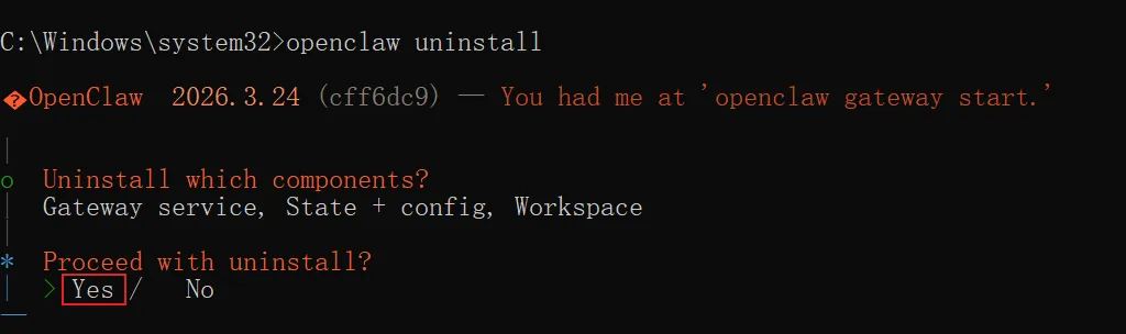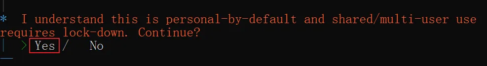 我们在「以管理员身份运行的 cmd」中运行openclaw onboard --install-daemon,在安全提醒这里选择 Yes:可以通过左箭头选择然后回车,也可以直接按键盘 Y