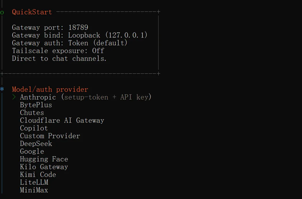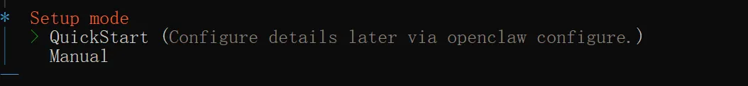设置模式这里选择QuickStart,该模式配置项更少,无需手动设置 Workspace 目录、Gateway 端口号等,均沿用默认配置;反之,选择 Manual 的话,除了 QuickStart 的设置项之外,像是 Workspace 目录、Gateway 的端口号这些都会让我们设置。