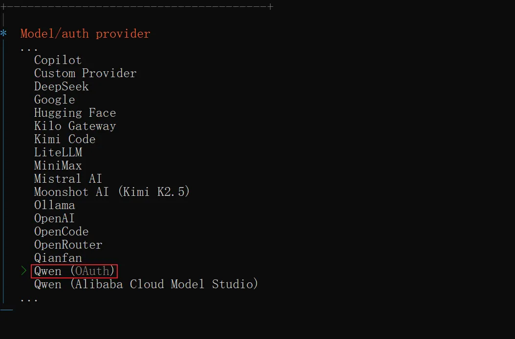 选择模型厂商这里,我们先选择这个 Qwen (OAuth),因为它是免费的,同时页面授权的方式不需要我们上来就去其它平台管理 apiKey,非常适合 OpenClaw 新手体验阶段。等我们确认 OpenClaw 顺利安装好之后,再去挑选合适的大模型都是可以的。当然,这里的免费是有使用频率限制的,不过用来验证 OpenClaw 的安装足够了。模型的选择与配置涉及先进性、性价比、多模态配置等多个维度,我会在后续为大家详细讲解,这里我们先聚焦到 OpenClaw 的安装上。