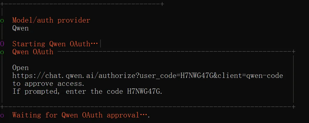 回车之后,引导程序自动打开浏览器跳转至 Qwen Chat 的授权页让我们登录授权,此时终端中显示等待授权中。