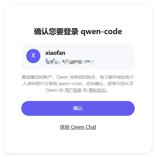 登录后点击确认,即可完成授权。若无账号可先注册,担心注册时丢失授权页的话,可提前复制授权页链接,后续若无法返回,通过该链接就能重新打开授权页。授权页链接是类似这样的:https://chat.qwen.ai/authorize?user_code=A0Y8IAKS&client=qwen-code