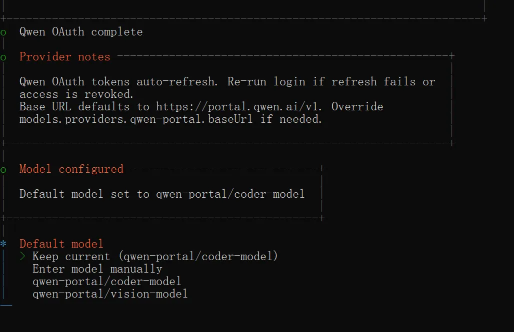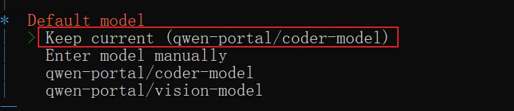 接下来到了选择默认大模型的环节。Qwen Chat 这个厂商提供了两个模型,这里是让我们选择一个默认的模型,那我们这里就保持默认,选择第一项:Keep current
