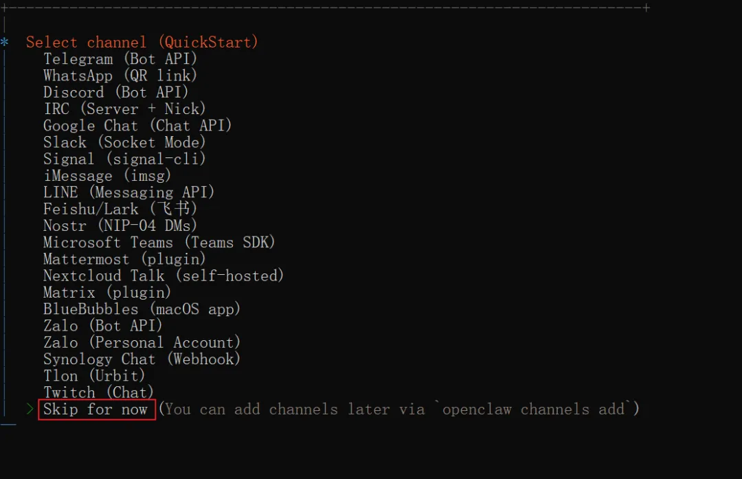 聊天渠道这里我们选择跳过,后边再配置都是可以的。