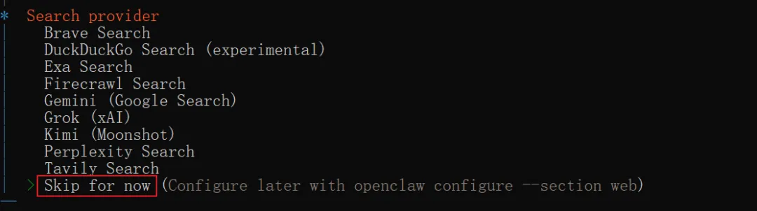 搜索提供商环节同样选择跳过,这类配置均需在对应平台生成 apiKey,且大多为国外服务商,并非本次安装必需,后边我们再来构建搜索能力。