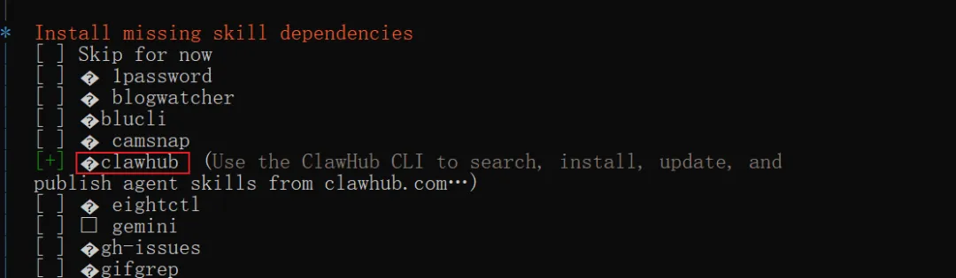 在技能列表中,我们暂时只勾选这个 clawhub,这样会帮我们安装 clawhub 命令,clawhub 是后期用来安装技能要用的命令。这里要注意方向键选择之后,还要按空格键确认,左边显示+号才表示选中了,再按空格键盘表示取消勾选。