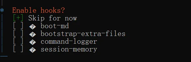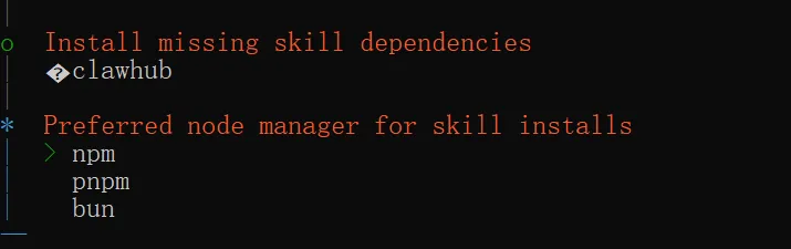 如果在这一步你的这个技能列表没有 clawhub 这一项,则说明你的环境中已经有 clawhub 命令了,技能 clawhub 已完备,不需要安装依赖,所以在这里没有列出。大概率是你之前安装过 OpenClaw,卸载的时候没有卸载 clawhub 命令。这种情况下这一步你就选择 Skip for now 就可以了。