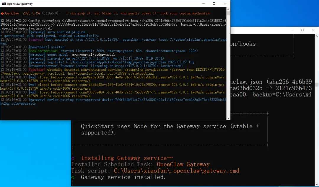 之后引导程序会自动安装 Gateway 后台服务,自动在新窗口启动 Gateway。这个新窗口不要关闭,关闭的话,Gateway 也就关闭了。