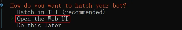 最后一步,询问你要怎么开始使用你的机器人。那么到这里 OpenClaw 已经初始化成功了,Gateway 也已经启动了,这里仅仅是在引导你使用它:可以通过 TUI(指的是在终端中使用),也可以通过 Web UI,也可以稍后再去使用它。
