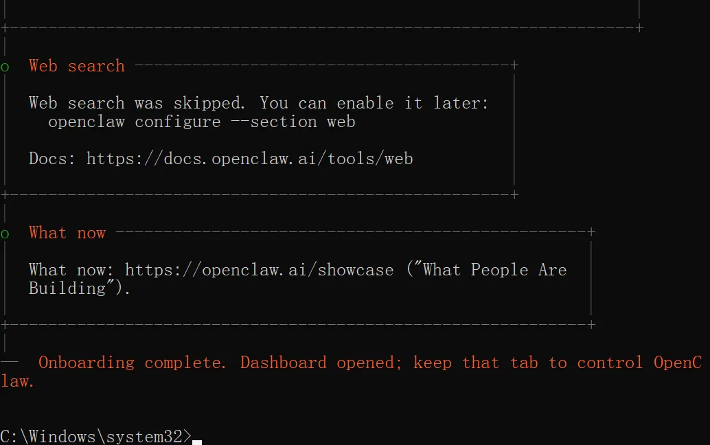 那这里我们选择通过 Web UI 打开它,然后引导程序会自动用浏览器打开 OpenClaw 控制页面。