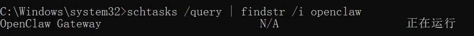前边不是说 Gateway 被安装成了 Scheduled Task 吗?我们同样可以通过命令schtasks /query | findstr /i openclaw查看一下有没有这个服务。