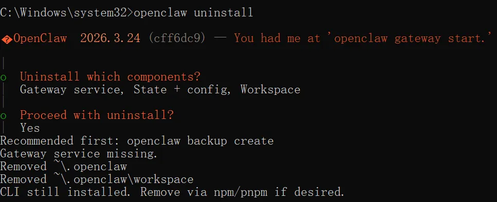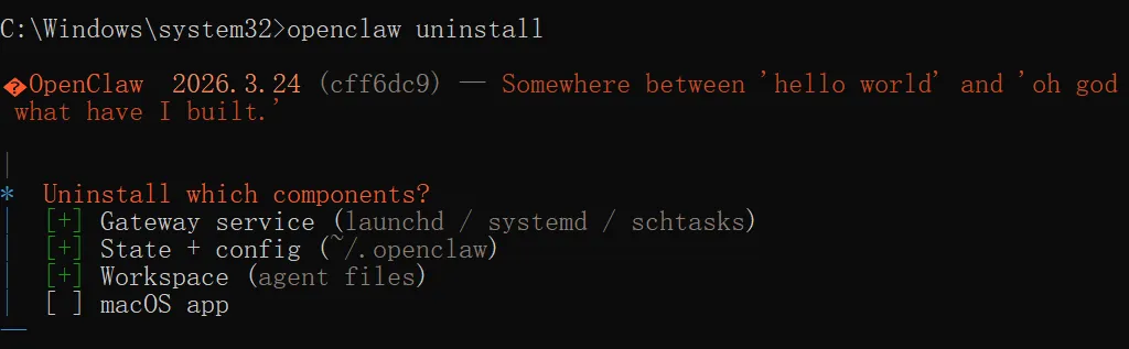 如果这个 Onboarding 过程某些步骤失误了,Ctrl+C 退出引导,然后执行openclaw uninstall,基本上就能回到 Onboarding 之前的状态,也就是 OpenClaw 刚装好的状态。如果这个过程中 clawhub 命令被安装了,那就再加个卸载 clawhub 的命令npm rm -g clawhub。然后你再重新执行openclaw onboard --install-daemon