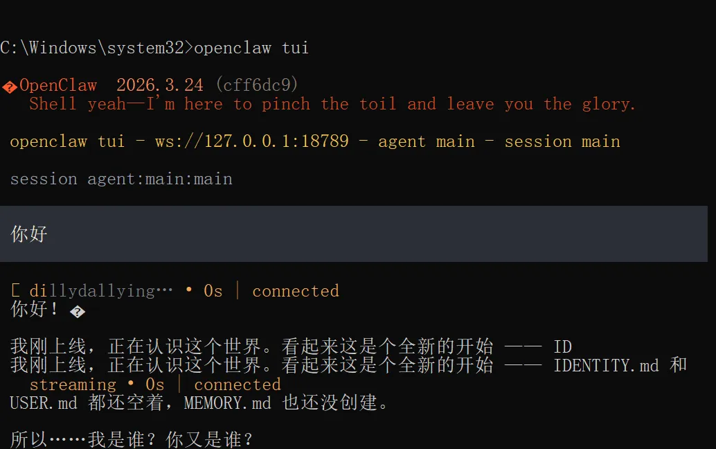 之前最后一步让我们选择使用方式的时候不是有个 TUI 的选项吗?我们可以通过命令openclaw tui打开它,在终端里就能直接对话。