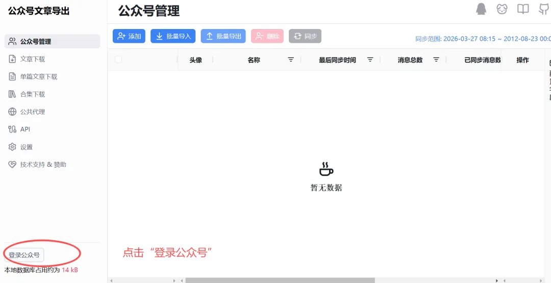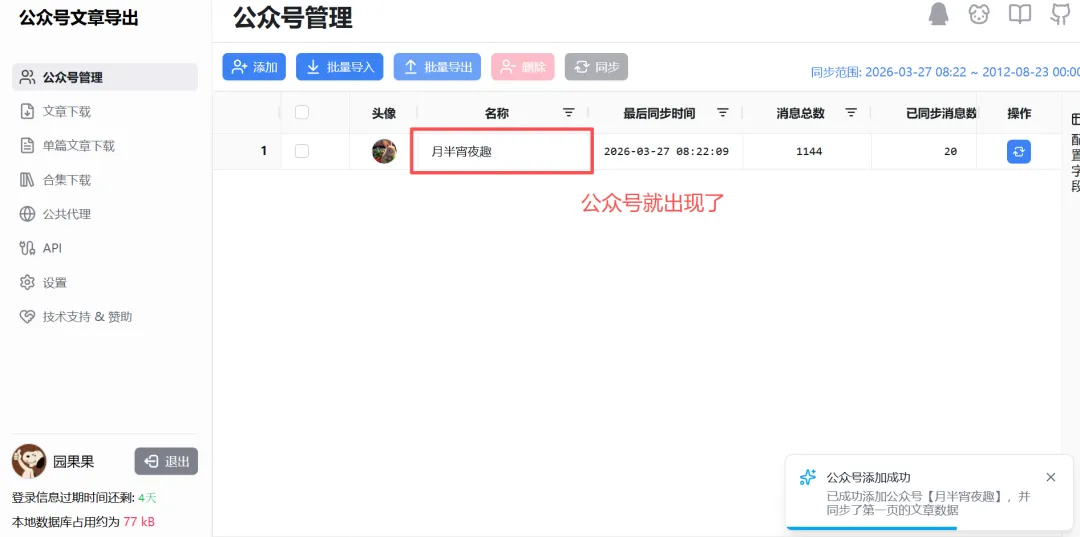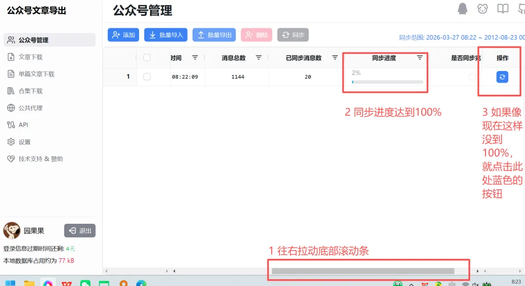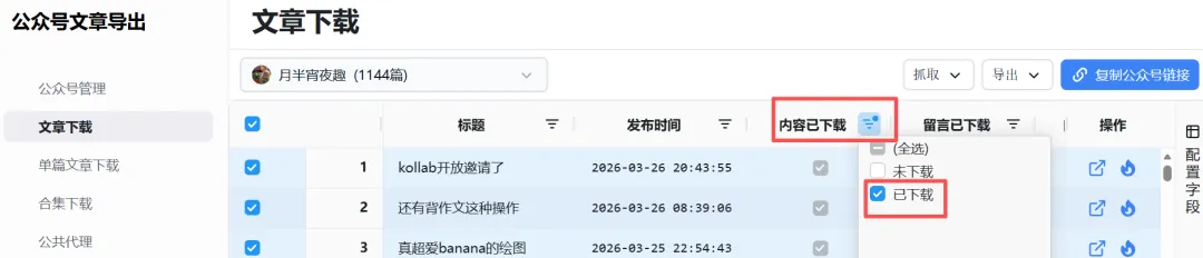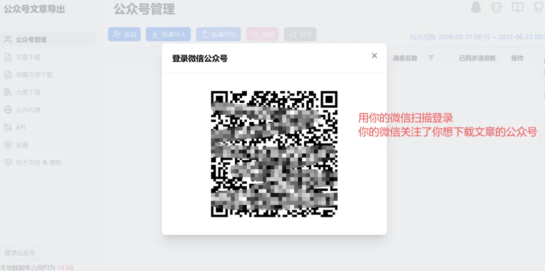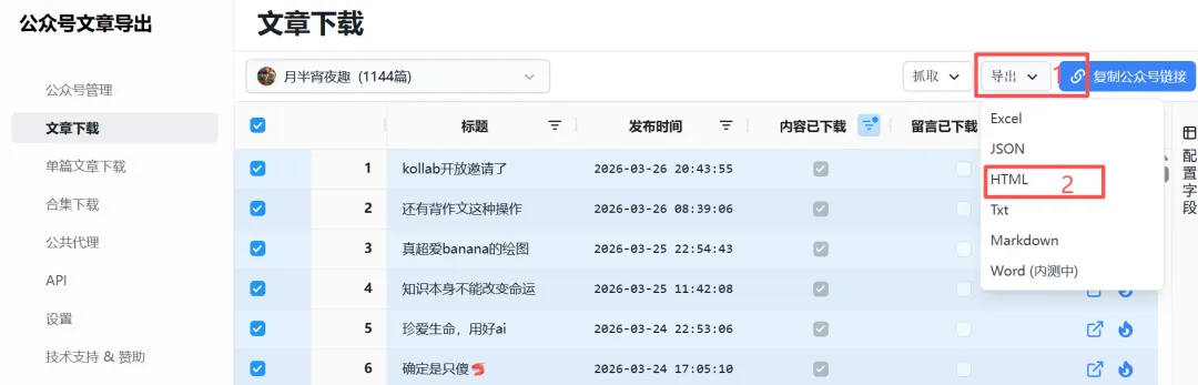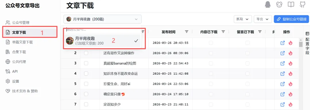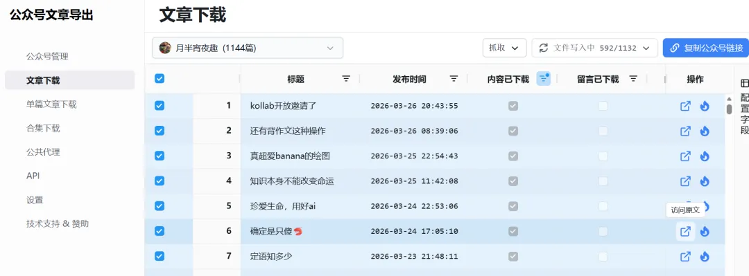 2.抓取失败。网址因为是公共代理,资源有限,如下图,一般早晨8点刷新,所以【赶个早八基本能成功】。用你的微信扫码登录,记住你的这个微信号是关注了你想下载文章的公众号的。选择“公众号管理”,然后点击“添加”,也就是准备添加你心仪的公众号了。拉动底部滚动条,查看“同步进度”,如果不是100%,可点击“操作”蓝色按钮进行刷新。全选文章,或者根据需求,此处200是因为我没刷新完,用作示范抓取有可能失败,可以先选择内容下载成功的先导出,后面再单独抓取未下载的。