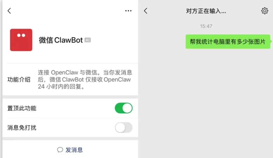 绑定完成,好友列表里会多一位叫微信 ClawBot 的联系人,形态跟之前的元宝有点像,可以设置免打扰,可以指定在顶上,聊天窗口就常驻在那,日常对话发过去。