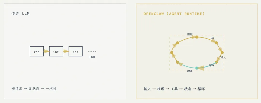 • 传统 LLM: request → inference → response → 结束 • OpenClaw(Agent runtime): 输入 → 推理 → 调用工具 → 写入状态 → 等待 → 再推理 → …(循环)