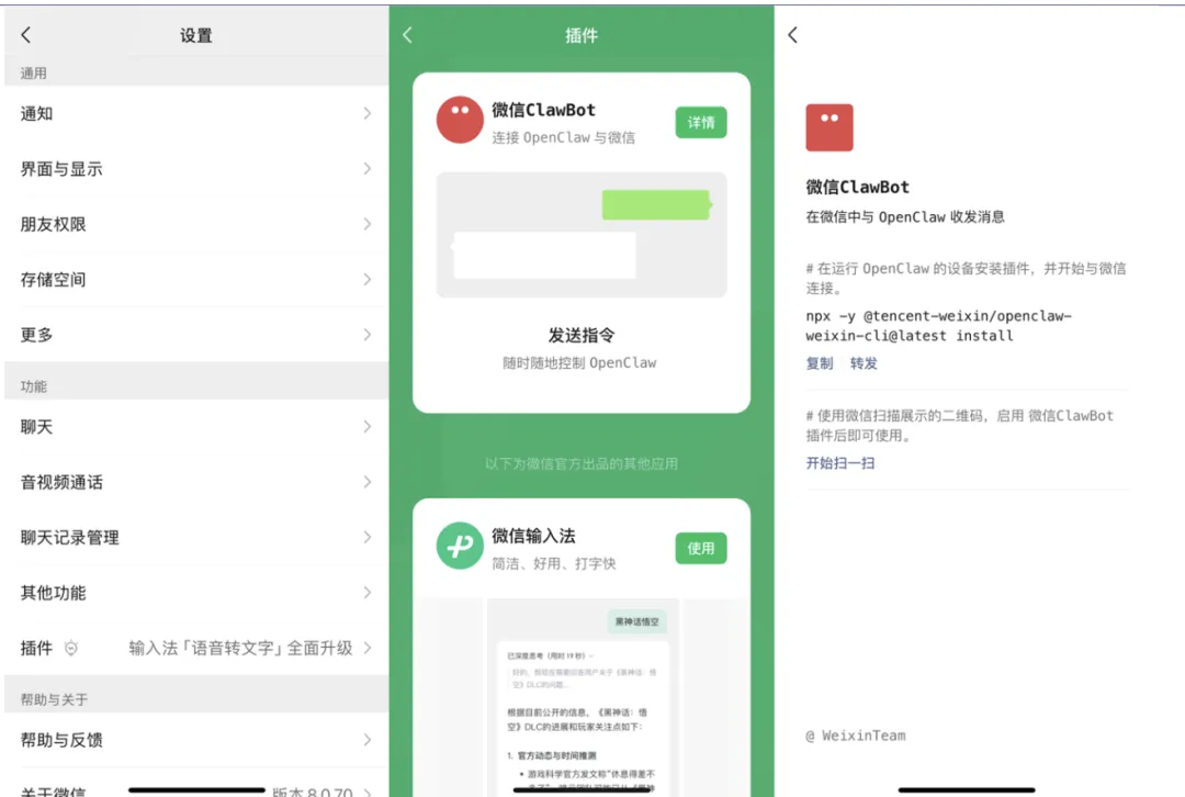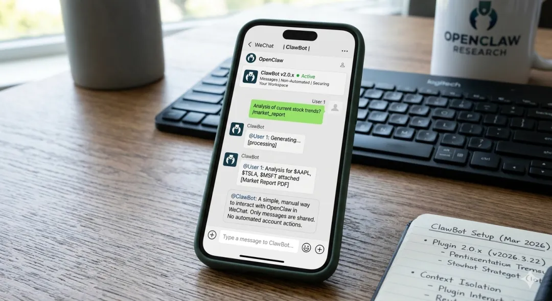 微信 ClawBot 是官方于 2026 年 3 月推出的新插件,专门为个人用户打通了与开源 AI 框架 OpenClaw 的交互通道。 官方明确表示,该插件仅作为“消息收发通道”,不涉及自动化操作。这意味着它不会窥探聊天记录或朋友圈,定位非常纯粹:这就是一个轻量级的移动端交互接口。对于投研工作流来说,它更像是一个随手可用的指令入口,而非繁琐的深度办公平台。