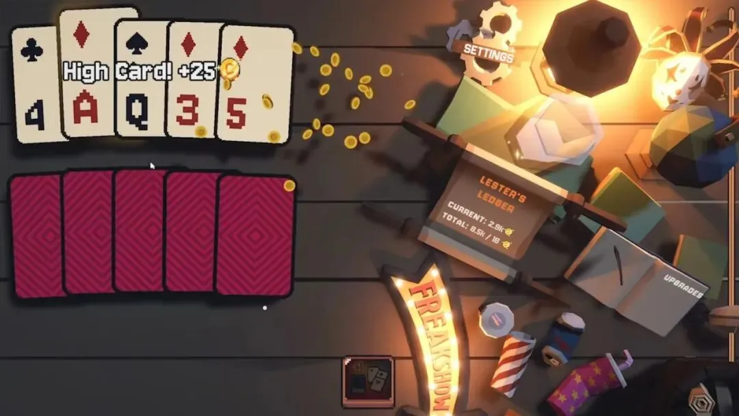 《翻天喜地凑大钱》是2025年12月发售的一款点击放置类卡牌游戏,英文名叫This Ain't Even Poker, Ya Joker。如果你玩过《小丑牌》又玩过《饼干点点乐》,大概就能想象这玩意儿长啥样——它把扑克牌型的那套得分逻辑抽出来,和增量游戏那种“数字越滚越大、停不下来”的瘾给缝在了一起。游戏开场就把你按在桌上:欠了小丑十个亿,困在他的嘉年华里,唯一的出路就是翻牌凑钱还债。对,就是字面意义上的翻牌,没有任何对手,不需要任何牌技,你对着屏幕上一副副扑克点下去,凑出对子、顺子、同花这些牌型,系统给你金币,然后你继续翻。