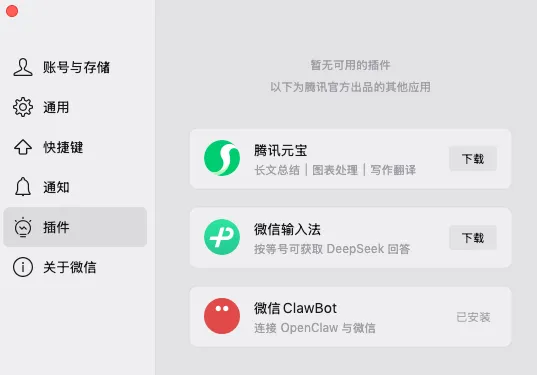 近日,PC/Mac微信 4.1.8 版本再次更新,已经支持微信 ClawBot 插件。