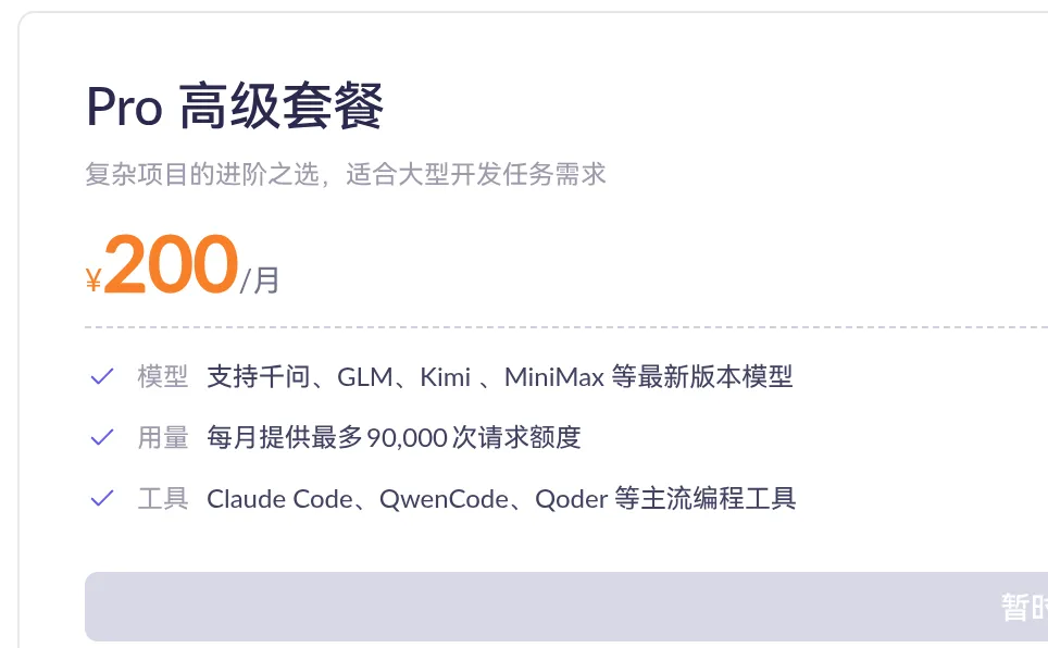 5. 阿里云百炼(千问为主)Coding Plan:优势也是除了自家模型外,还可以使用GLM、Kimi和Minimax等几家国产模型。原来有基础版每月40元,现在已经没有了,只有高级版本200元/月,日常使用还是贵了点。WECHATIMGPH_6