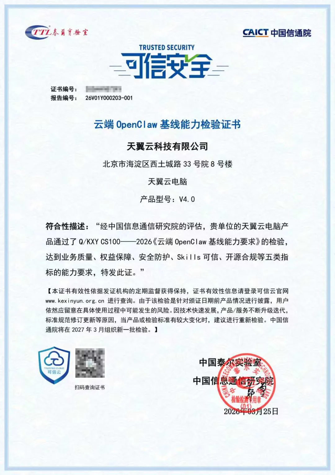近期,天翼AI云电脑依托中国电信深厚的云网安全技术积淀、成熟的云端管控体系,经过严苛检测与全面核验,顺利通过中国信息通信研究院“云端OpenClaw基线能力评估”认证,为“养虾”筑牢云端安全防线。