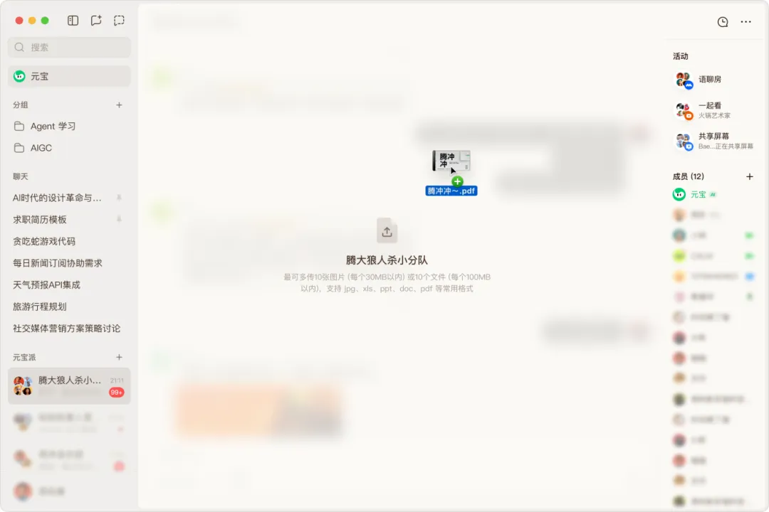 此次元宝派电脑版的上线,并非简单的跨端移植,而是针对电脑端大屏优势的深度体验重构。在电脑端,用户可实现共享屏幕与聊天互动的并行操作,一边参与团队的大屏演示、影音共赏,一边在独立窗口与派友、元宝AI实时交流,告别了手机端小屏的操作局限。同时,文件处理效率迎来质的提升,支持文件拖拽上传、实时截图粘贴,无论是jpg、xls、ppt等常用格式的图片与文档,都能一键传输,单文件最大支持100MB,多文件批量处理也能轻松实现,让信息流转无需繁琐操作,所见即所得。