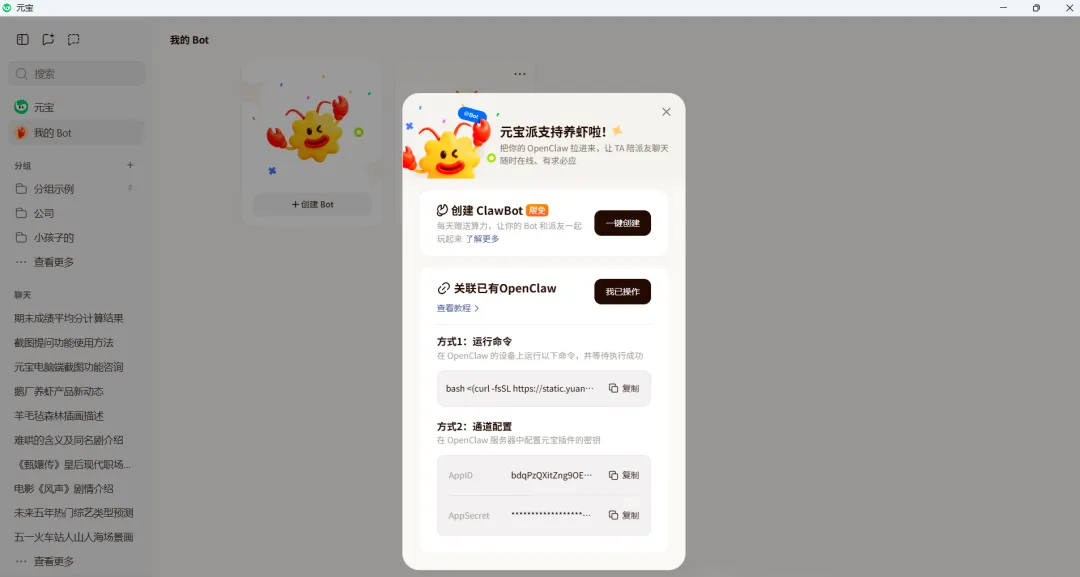 而此次升级的核心亮点,当属对OpenClaw龙虾智能体的深度整合,让龙虾社交成为元宝派电脑版的核心标签。OpenClaw作为开源的AI智能体框架,核心价值在于让大模型从“对话”走向“执行”,化身用户的专属“数字员工”,而元宝派电脑版则让这一能力在协作场景中发挥到极致。用户不仅能通过扫码、运行命令、手动配置等方式,将已有的专属龙虾Bot引入派中,还能参与限时福利活动——3月25日至4月1日,每天12:00和20:00,在元宝派点击「我的Bot」-「一键创建」,即可免费领取龙虾智能体,零技术门槛拥有专属AI助手。