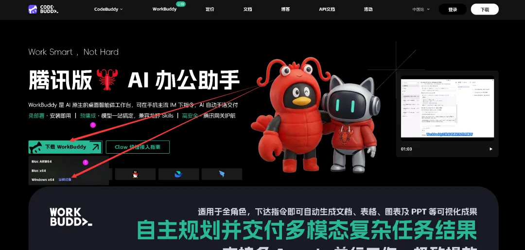 我们在WorkBuddy官网点击【下载 WorkBuddy】,选择当前系统