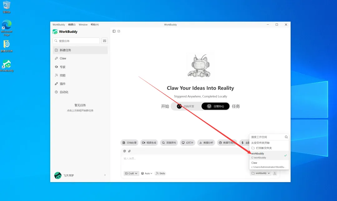 我们在开始使用前,需要先完成工作目录的配置。该目录是 WorkBuddy 的默认读写路径,软件会从这里加载文件,同时所有新建内容也会自动保存在该目录下。如果没有手动指定其他路径,所有任务都会默认在这个目录下运行。这里我们设置工作目录为
