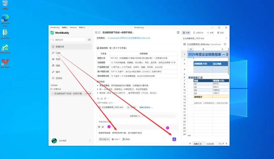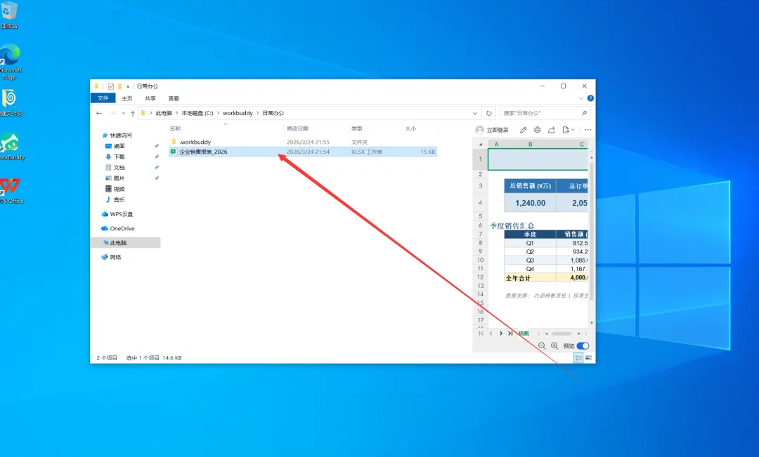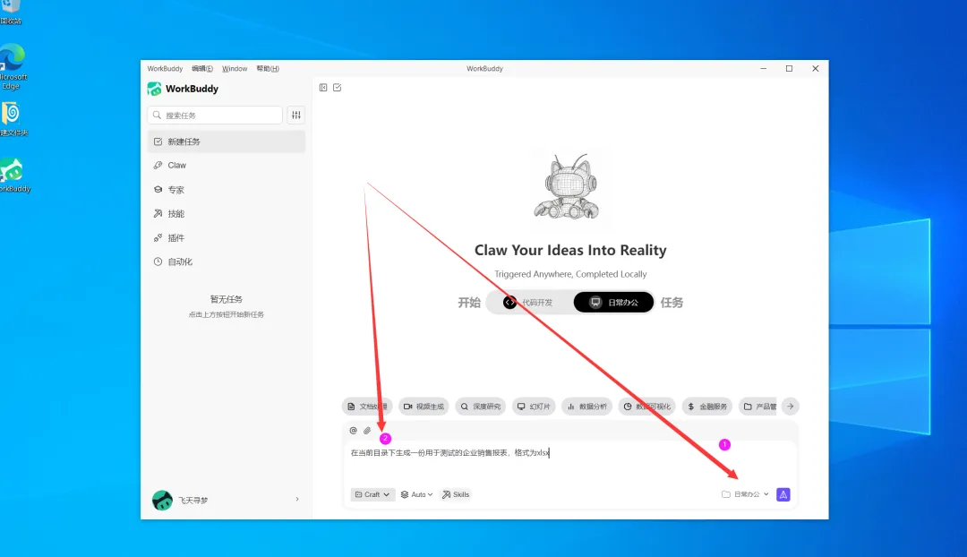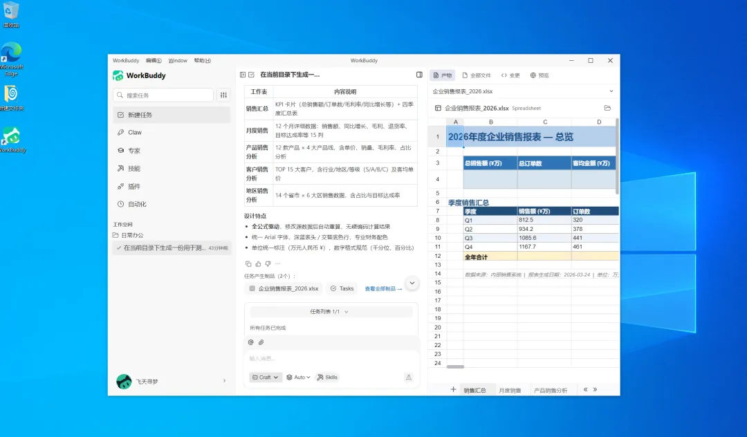 我们首先创建名为【日常办公】的工作目录,并指令 WorkBuddy 在该目录下生成一份用于测试的企业销售报表。