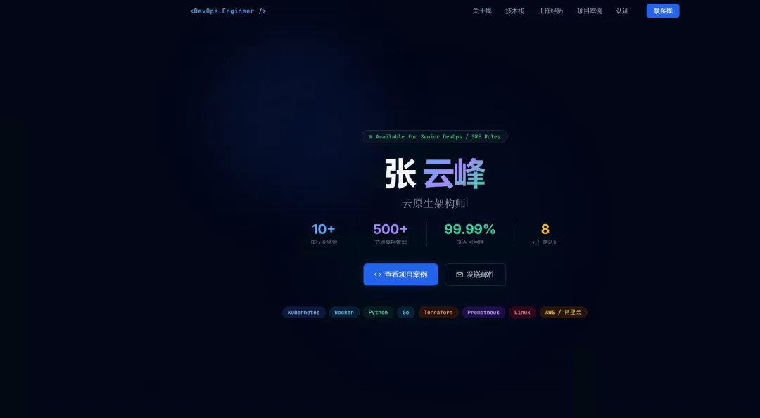 基于10年云计算运维背景(精通Python/Go、K8s、Docker及Linux等技术栈),生成一个单文件静态个人简历网站。