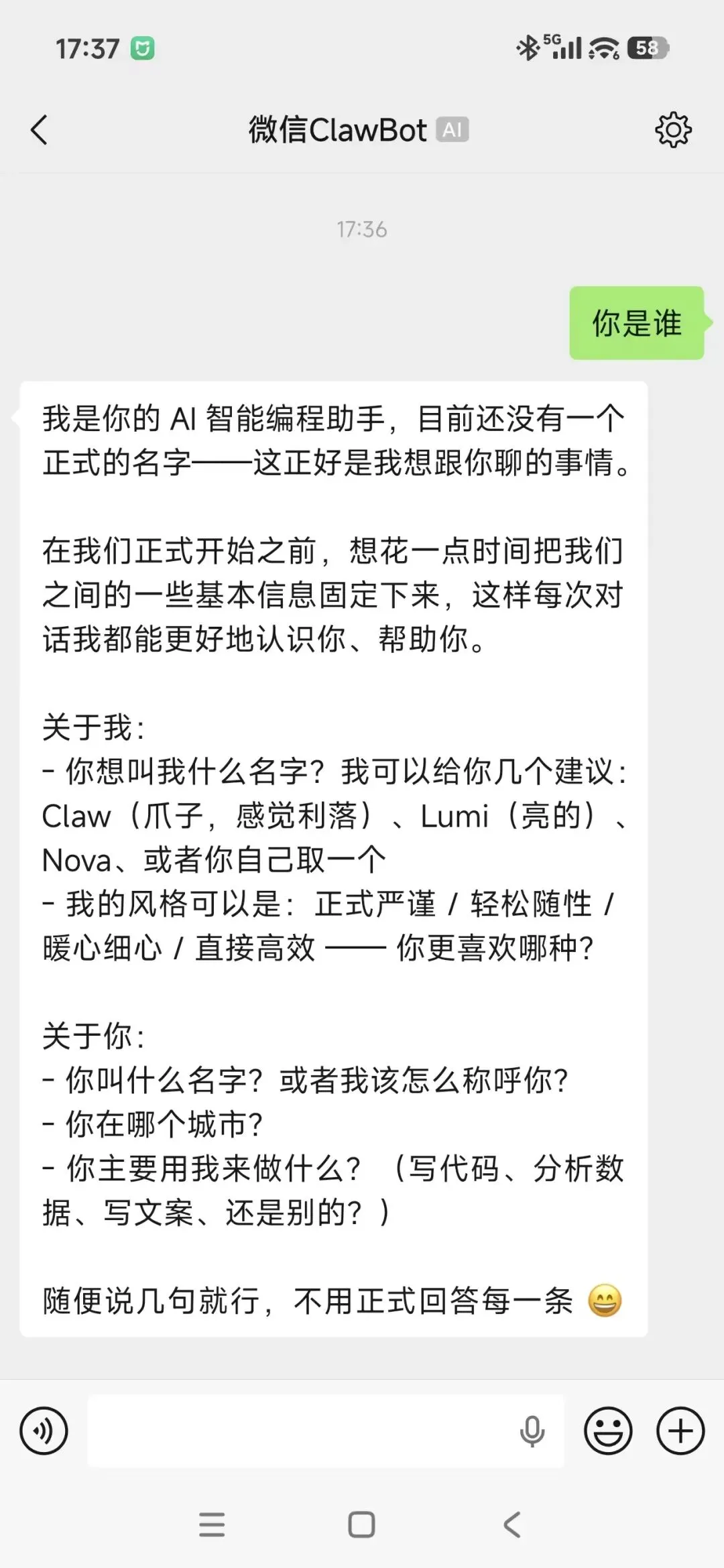 在个人微信中搜索并找到 ClawBot,在对话框内发送“你是谁”进行简单测试。若 ClawBot 正常给出回复,即代表 WorkBuddy 接入个人微信成功。