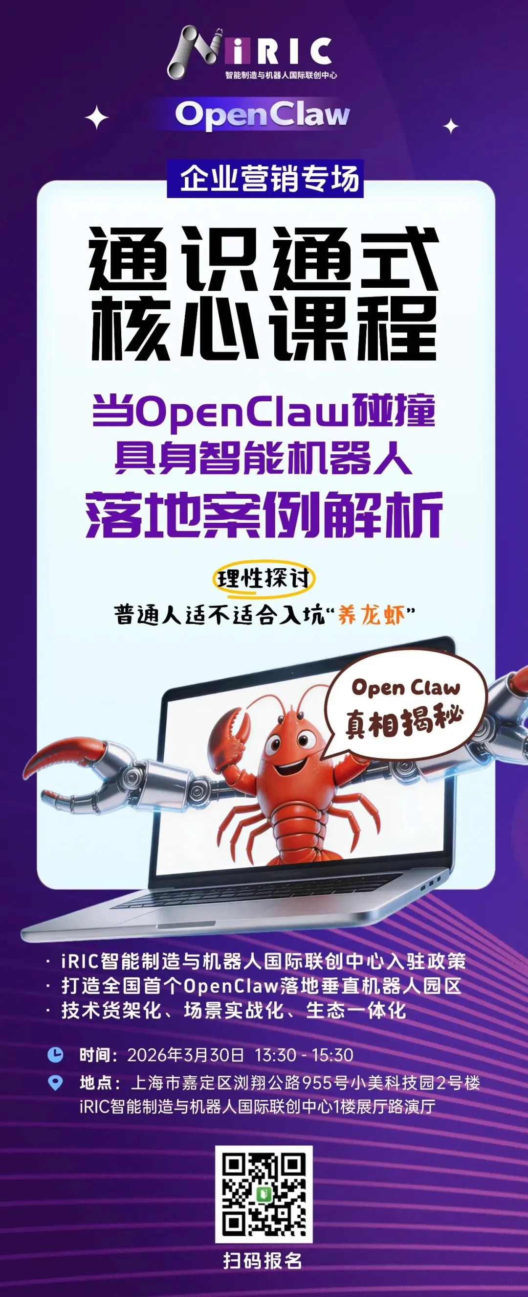 然而,使用者在实际部署过程中常面从认知到业务落地的各种信息偏差,为了深入探讨OpenClaw的通识通式核心价值,由iRIC智能制造与机器人国际联创中心携手合作伙伴(AI+机器人、原IBM/蚂蚁金服/阿里云/华为云技术专家)共同带来的OpenClaw通识课程,通过技术解析+实操演练+生态对话的形式,助力企业家伙伴们,降低OpenClaw的部署门槛,缩短研发到落地的周期;建立标准化维护流程,提升系统稳定性与可扩展性;同时探索iRIC作为上海市数字公共服务驿站为生态链企业带来的数字服务,推动 AI 智能体在自主作业机器人领域的结合与落地,实现技术成果的高效转化。