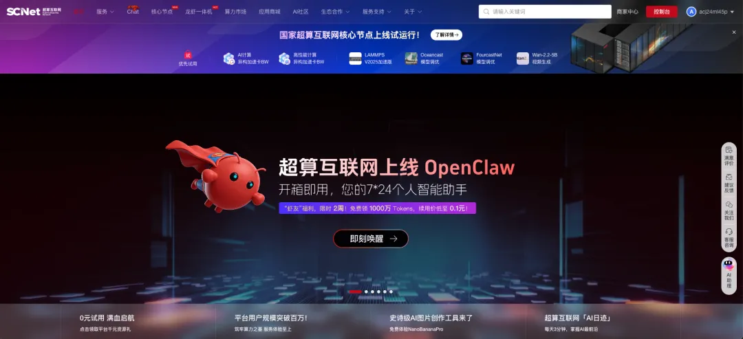 登录超算互联网平台(www.scnet.cn),进入「AI服务」→「OpenClaw」板块;