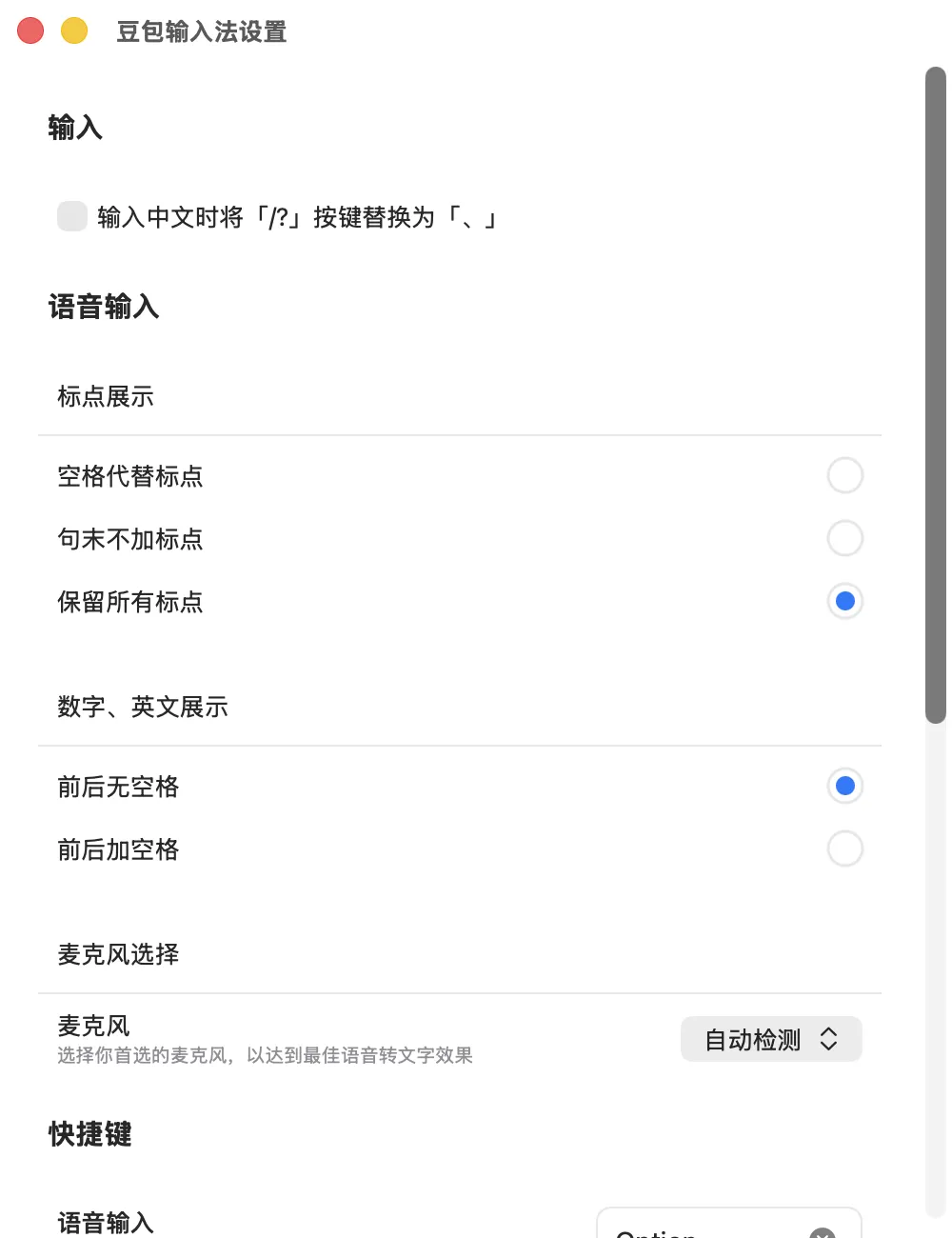 目前豆包输入法电脑版支持的功能设置并不多,但是一些基础的功能都已经加进来了,主要也都是针对语音输入法的一些基础设置。包括标点输入、数字英文空格、语音输入快捷键、状态切换快捷键。
