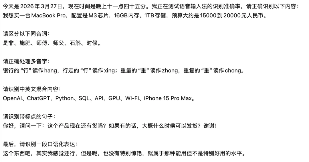 今天是2026年3月27日,现在时间是晚上11:45。我正在测试语音输入法的识别准确率,请正确识别以下内容。我想买一台MacBook Pro,配置是M3芯片、16GB内存、1TB存储,预算大约是1万5到2万人民币。请区分以下同音词,是非、施肥、师父、师傅、石斛、时候。请正确处理多音字,银行的行读作行,行走的行读作行,重量的重读作重,重复的重读作重。请识别中英文混合内容,OpenAI、ChatGPT、Python。 SQL、API、GPU、WiFi、iPhone 17 Pro Max。请识别带标点的句子。你好,请问一下,这个产品现在还有货吗?如果有的话,大概什么时候可以发货?谢谢。最后,请识别一段口语化表达。这个东西吧,其实我觉得还行,但是呢,也没有特别惊艳,就属于那种能用但不是特别好用的水平。如果不是特别吹毛求疵的话,可以说识别准确率已经达到了100%,全段文字没有明显错别字。如果说稍微严格一点点的话,识别准确率也在98% 以上。