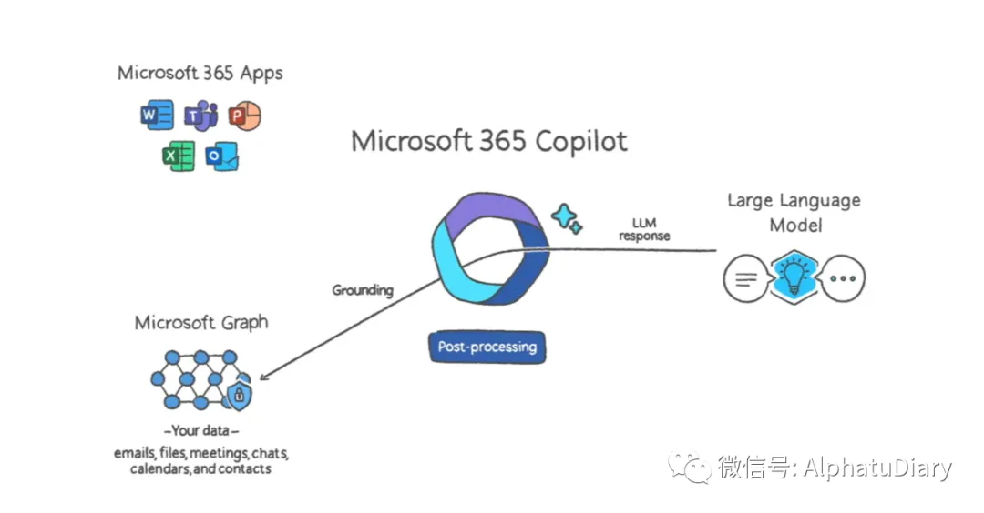 Spataro提出,Microsoft 365 Copilot是由Copilot系统提供的。这个系统将Word、Excel和PowerPoint等Microsoft 365应用与微软智能图谱以及GPT-4相结合。Copilot使用 grounding来提高其生成的Prompt的质量。如果我们要求Word根据数据创建一个文档,Copilot会将该提示发送到微软图谱以检索上下文和数据,然后再修改提示并将其发送到GPT-4大型语言模型。然后,响应会被发送到微软图谱,进行额外的接地、安全和合规性检查,然后再将响应和命令发回给微软365应用程序。