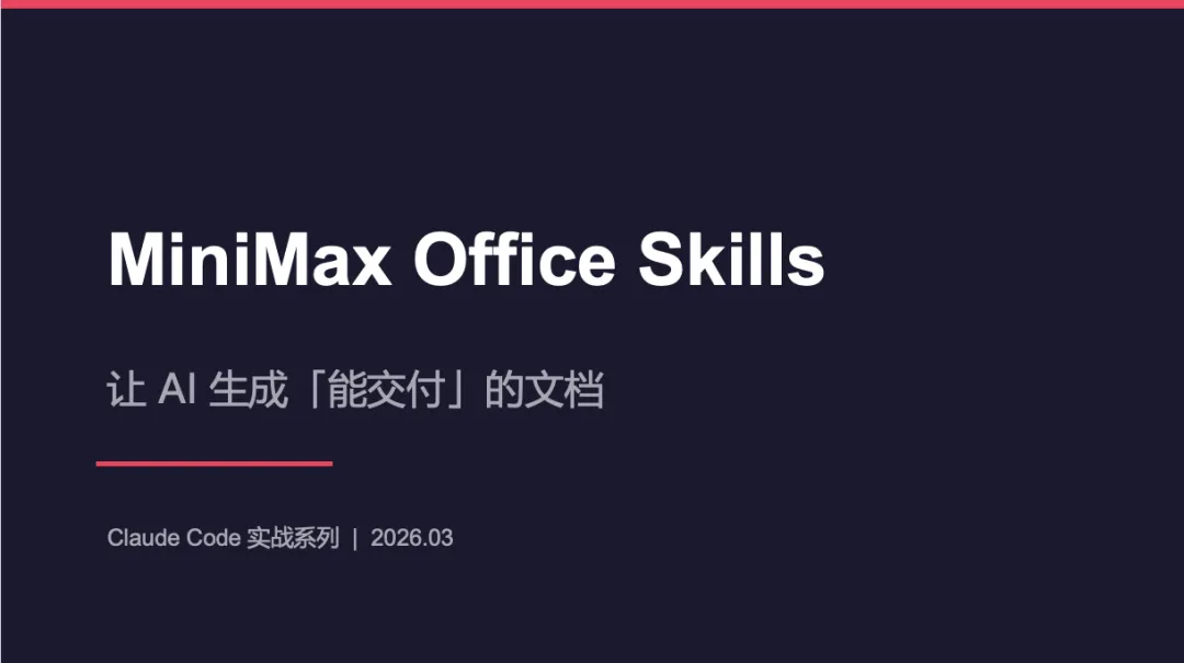 3 月 22 日,MiniMax 开源了一个 Skills 仓库(MIT 协议),开源后数日内 GitHub 星标快速涨到 6K+。仓库里有 14 个 Skill,其中 Office 部分覆盖了 PPT、Excel、Word、PDF 四种格式。