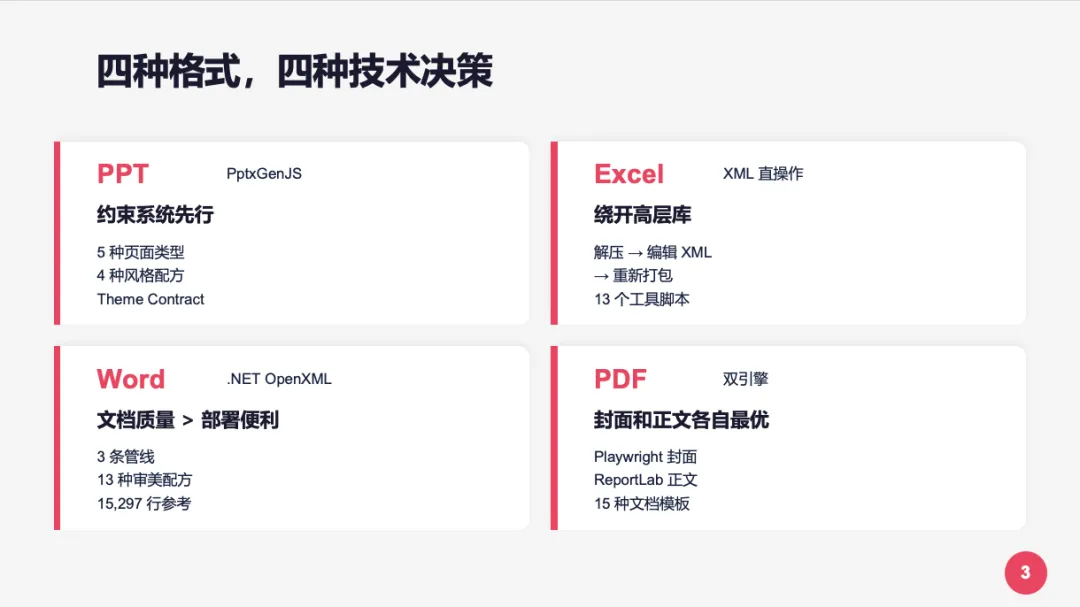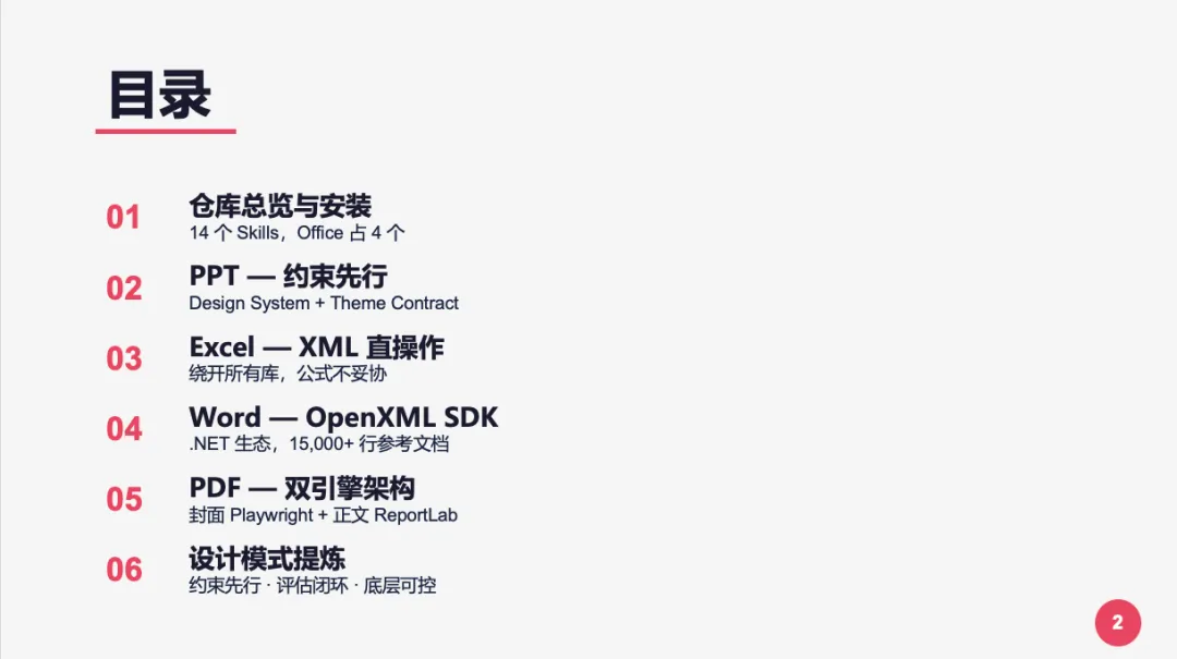 • PPTX:Theme Contract + Slide Taxonomy → 颜色和布局在动手前就锁死 • XLSX:公式硬规则 + 财务色彩标准 → 数据完整性在动手前就有保障 • DOCX:元素顺序规则 + XSD Schema → 文档结构在动手前就有规范 • PDF:Token 设计系统 + 15 种类型模板 → 视觉风格在动手前就确定