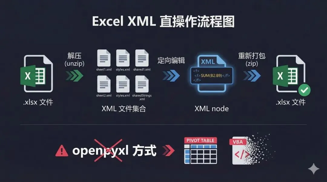 .xlsx 文件 ↓ 解压XML 文件集合(xl/worksheets/sheet1.xml, xl/styles.xml, ...) ↓ 定向编辑目标 XML 节点 ↓ 重新打包.xlsx 文件为此,他们构建了 10 个独立的 Python 工具脚本,核心包括: