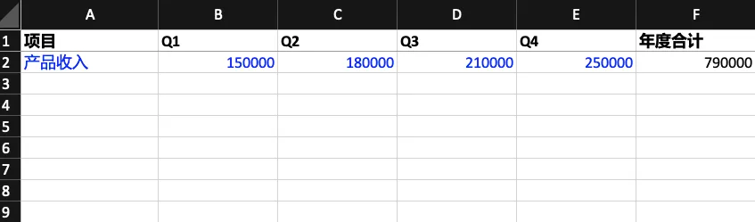 测试场景:生成一份季度收入报表,包含四个季度的数据、SUM 汇总公式、冻结首行、财务色彩。