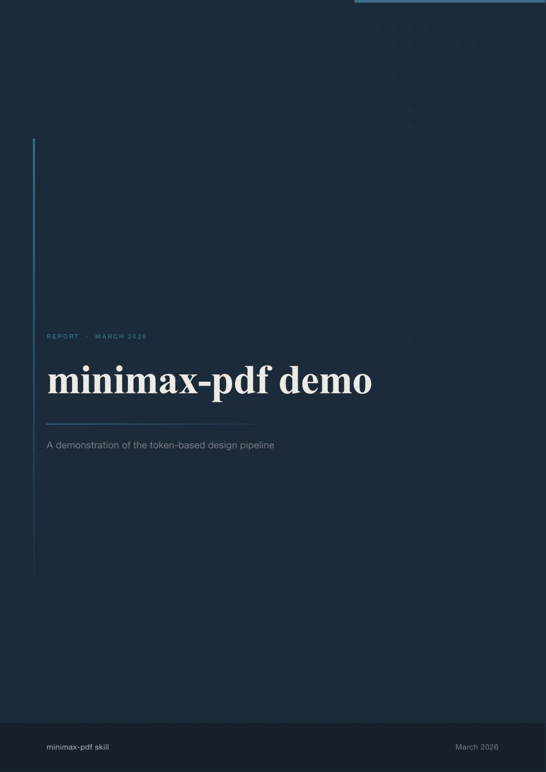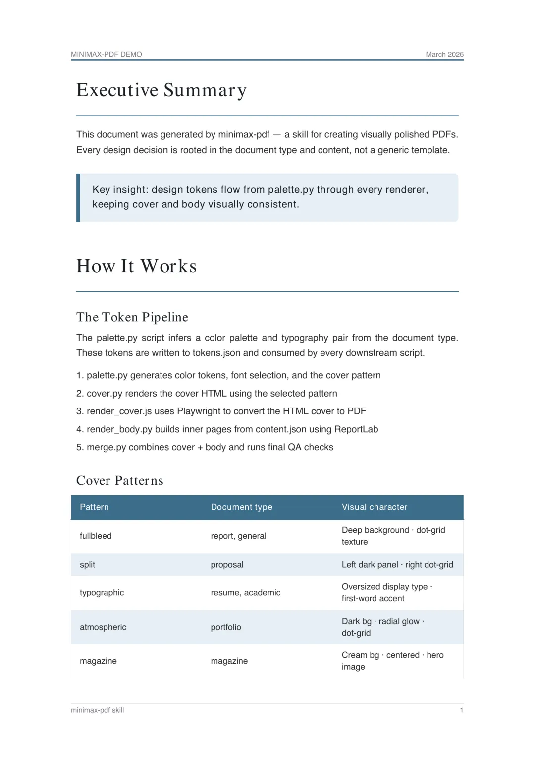 Token 设计系统:从文档类型衍生出颜色、字体、间距等 design token,贯穿封面和正文所有页面。palette.py 负责生成这套 token。